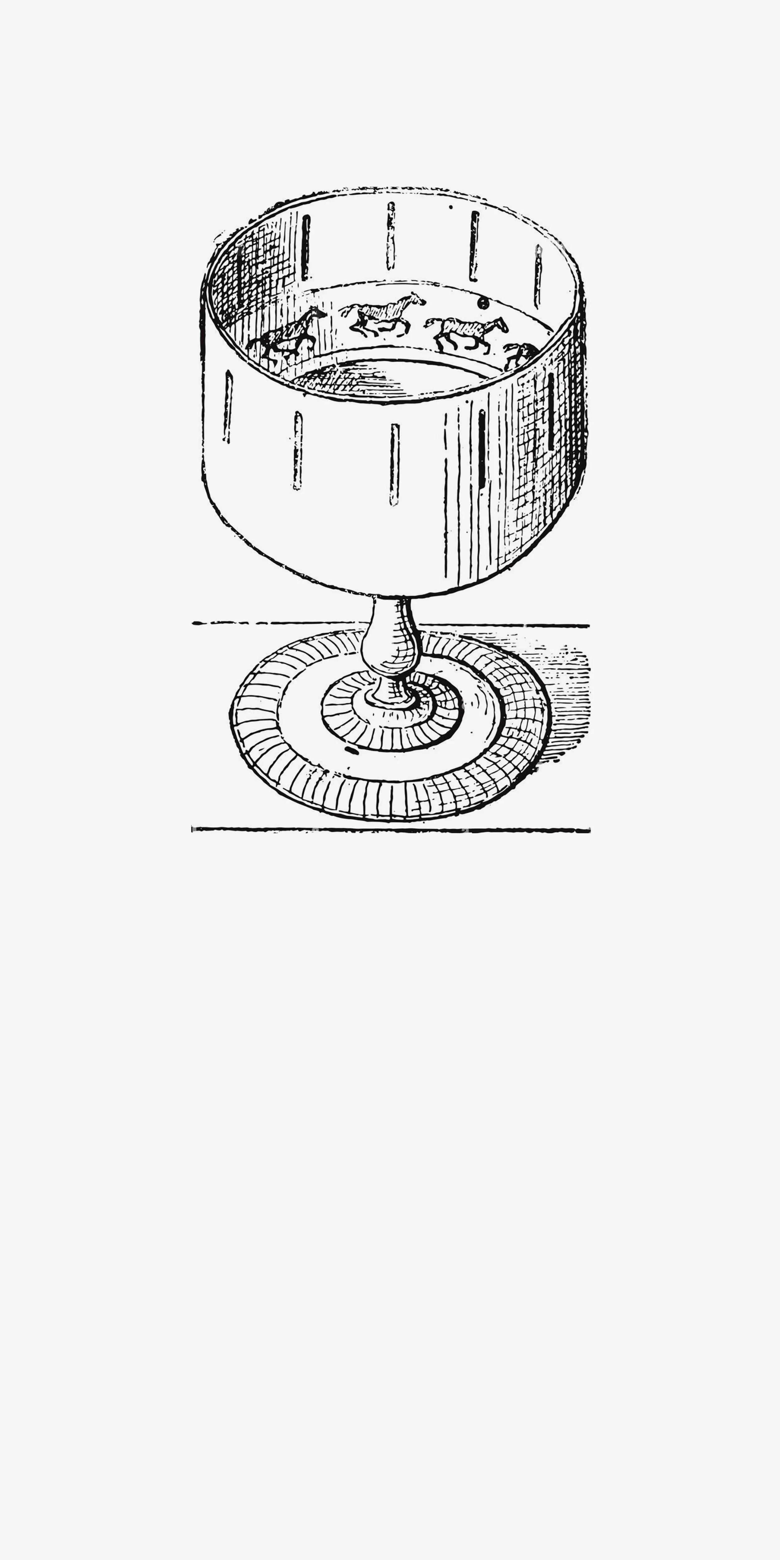 Developed in the early 1800s, the zoetrope (Greek for “wheel of life”) was a pre-film mechanical device that produced the illusion of motion by displaying a sequence of drawings or photographs showing progressive movements. The viewer sat close to the wheel, chose one vertical slit to look through, and saw the “moving” picture on the opposite side of the wheel’s interior ring.