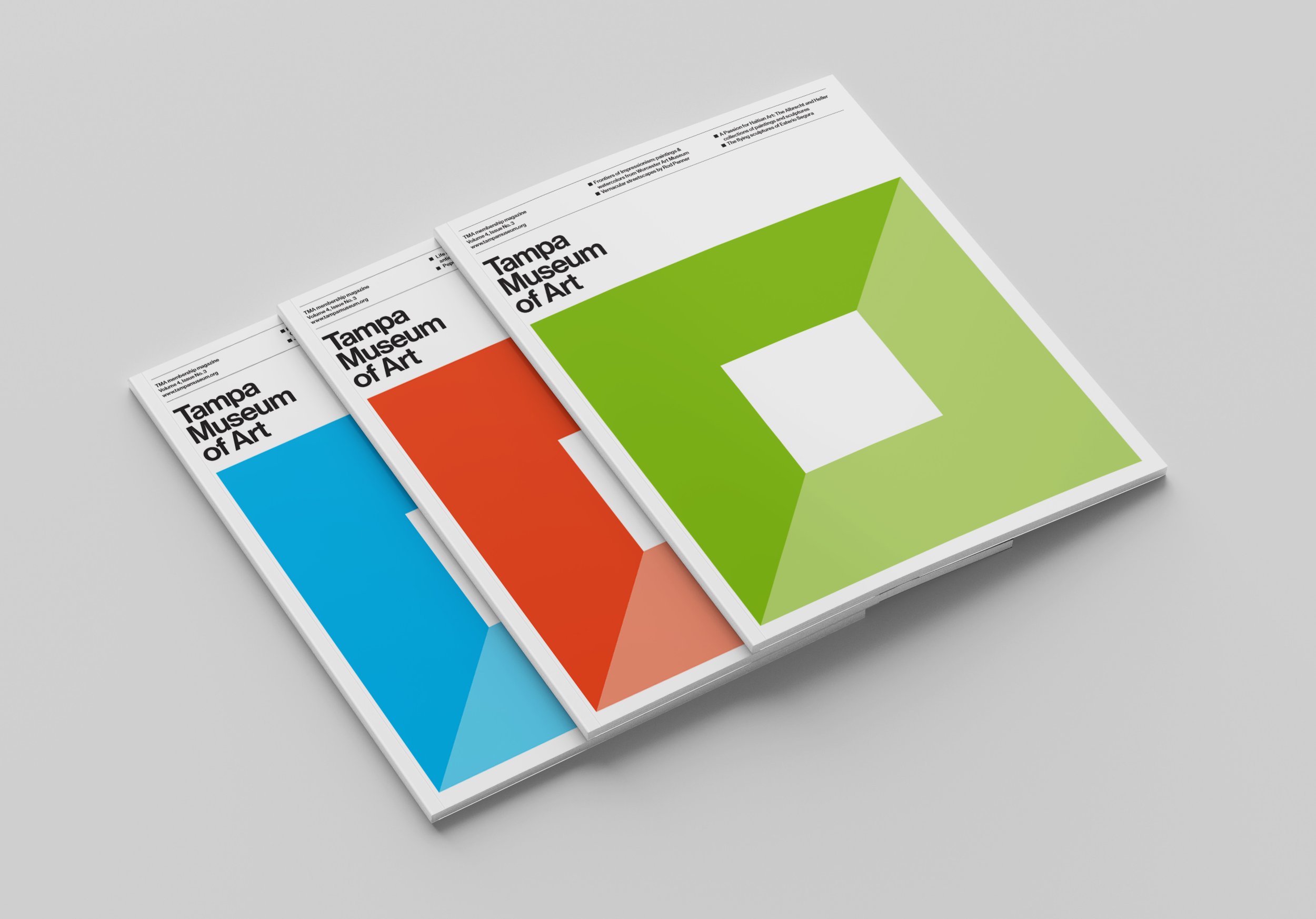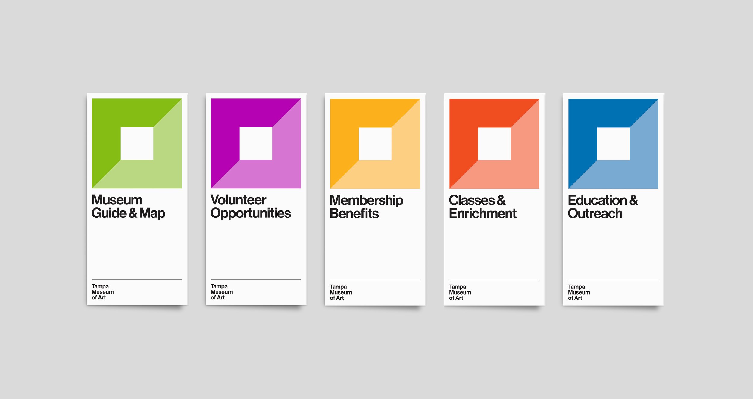 The Tampa Museum of Art’s collections span thousands of years, from the Classical sculptures of ancient Greece to street photography taken in the 2000’s. The visual branding lets the artworks take center stage, as the Modernist typography and color-coded publications guide visitors through the museum’s exhibitions and experiences.